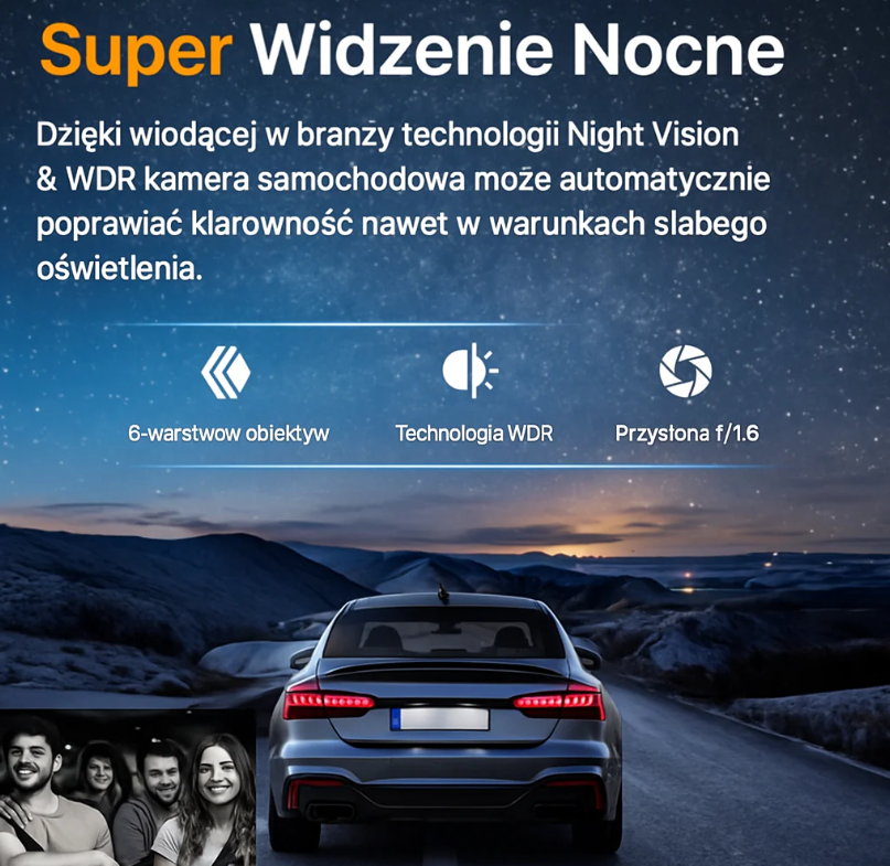 Zyskaj maksymalne bezpieczeństwo podczas jazdy po zmroku dzięki naszej kamerze samochodowej z zaawansowaną technologią Night Vision & WDR. Urządzenie automatycznie poprawia klarowność nagrań, eliminując prześwietlenia i cienie, aby każdy szczegół był widoczny nawet w najtrudniejszych warunkach oświetleniowych.